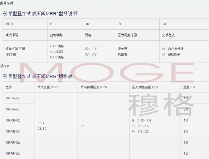 1、无锡穆格流体控制科技有限公司供应叠加式减压阀MPR具有如下型号:MRRP-02,MRRP-03,MRRA-02,MRRA-03,MRRB-02,MRRB-03,MRRP-02-B,MRRP-03-B,MRRA-02-B,MRRA-03-B,MRRB-02-B,MRRB-03-B,MRRP-02-C,MRRP-03-C,MRRA-02-C,MRRA-03-C,MRRB-02-C,MRRB-03-C,MRRP-02-H,MRRP-03-H,MRRA-02-H,MRRA-03-H,MRRB-02-H,MRRB-03-H。