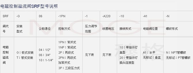 电磁控制溢流阀SRF具有如下型号:SRF-G06-1PN-1-10,SRF-G06-1PN-2-10,SRF-G06-1PN-3-10,SRF-G06-1NP-1-10,SRF-G06-1NP-2-10,SRF-G06-1NP-3-10,SRF-G06-2P-1-10,SRF-G06-2P-2-10,SRF-G06-2P-3-10,SRF-G04-1PN-1-10,SRF-G04-1PN-2-10,SRF-G04-3-10,SRF-G04-1NP-1-10,SRF-G04-1NP-2-10,SRF-G04-1NP-3-10,SRF-G04-2P-1-10,SRF-G04-2P-2-10,SRF-G04-2P-3-10,SRF-T06-1PN-1-10,SRF-T06-1PN-2-10,SRF-T06-1PN-3-10,SRF-T06-1NP-1-10,SRF-T06-1NP-2-10,SRF-T06-1NP-3-10,SRF-T06-2P-1-10,SRF-T06-2P-2-10,SRF-T06-2P-3-10,SRF-T04-1PN-1-10,SRF-T04-1PN-2-10,SRF-T04-1PN-3-10,SRF-T04-1NP-1-10,SRF-T04-1NP-2-10,SRF-T04-1NP-3-10,SRF-T04-2P-1-10,SRF-T04-2P-2-10,SRF-T04-2P-3-10,SRF-G10-1PN-1-10,SRF-G10-1PN-2-10,SRF-G10-1PN-3-10,SRF-G10-1NP-1-10,SRF-G10-1NP-2-10,SRF-G10-1NP-3-10,SRF-G10-2P-1-10,SRF-G10-2P-2-10,SRF-G10-2P-3-10,SRF-T10-1PN-1-10,SRF-T10-1PN-2-10,SRF-T10-1PN-3-10,SRF-T10-1NP-1-10,SRF-T10-1NP-2-10,SRF-T10-1NP-3-10,SRF-T10-2P-1-10,SRF-T10-2P-2-10,SRF-T10-2P-3-10。