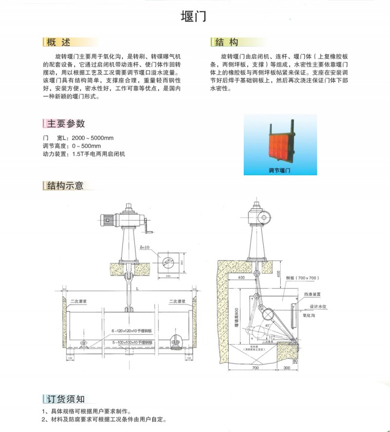 堰门调试 闸门的调试根据所配启闭机的不同而有所不同。 手动启闭机调试时仅需将闸门(堰门)开启(关闭)到位后调整限位螺母并固定。 手电两用启闭机在调试过程前,应根据电动装置电器原理图进行正确接线,然后按以下步骤进行: 1、将门板手动开启至中心位置,接通电源; 2、用点动按钮启闭闸门确定电机的正反转是否与闸门(堰门)的开启关闭状态相一致; 3、按照电动装置说明书进行上下行程限位调试工作; 4、调试结束后应进行一次点动状态下的启闭试验,以验证上下行程的可靠性。四、使用与维护 1、手动闸门(堰门)启闭时用力要均匀,当手感启闭力增大时说明闸门(堰门)已关闭或全开或异物卡阻,当有异物卡阻时应及时排除,以免损伤设备。 2、手电两用启闭闸门(堰门),当需手动启闭时应将手、电切换手柄切换至手动位置;电动时切换手柄会自动复位。 3、当进行线路检修涉及电源相位改变时,应对启闭机按第三章“调试”要求及步骤(1、2)进行相位确认,以确保闸门(堰门)的正常运行。 4、设备运行后,对手动启闭机轴承、传动螺母、螺杆等部件每季度至少加注一次润滑脂。电动启闭机应按其使用说明书的要求加注润滑油。