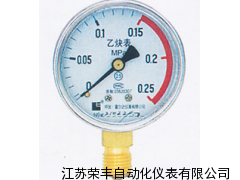 RF系列乙炔压力表主要用来测量乙炔的压力,属于禁油表的一种,因为在实际生产中乙炔表对压力表材质的特殊要求,所以乙炔压力表出来,成为压力表中的特种气体压力表。