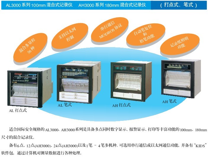 AL3000系列符合CE、UL和CSA的100mm多点与多用途数据同时显示的多功能记录仪,警报显示或者打印和其它独特的特点。