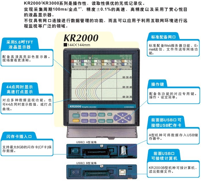 KR2000系列是装载有多彩显示的多功能记录仪,而且还是操作简单的无纸记录仪。标准配备有以太网接口,根据浏览器监视数据,FTP服务器、Email自动通报等的网络机能,能够方便的收集数据。