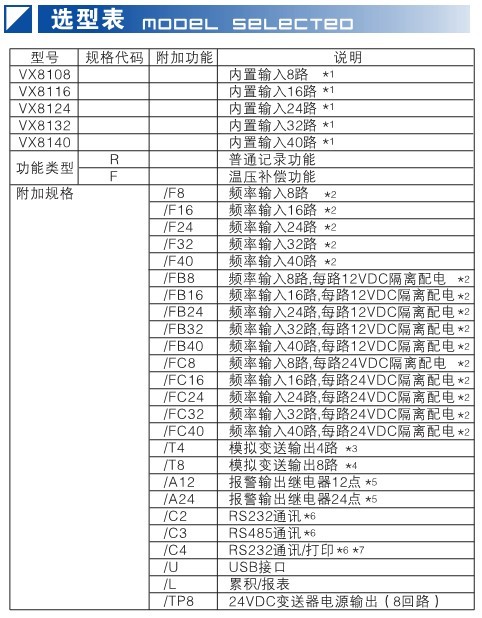 VX8000 为1-40路输入彩屏多通道温度记录仪,输入,可输入标准电流、标准电压、频率、毫伏、热电偶、热电阻等信号。具有传感器隔离配电输出、继电器报警输出、变送输出、流量积算、温压补偿、历史数据转存、打印以及远程通讯功能。
