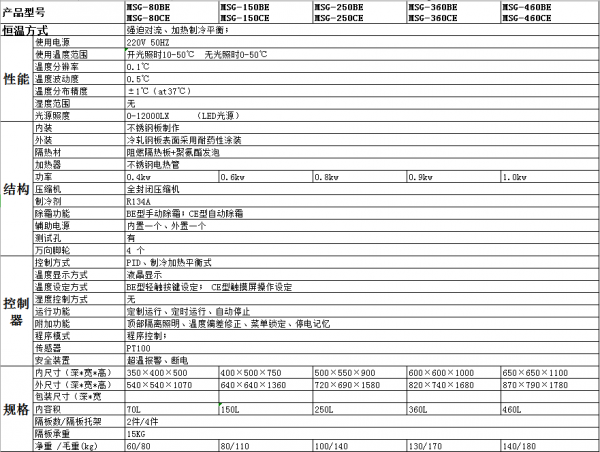 功能型光照培养箱MSG-460BE技术参数:参数是在温度低于25℃,相对湿度<80%RH的环境下测得