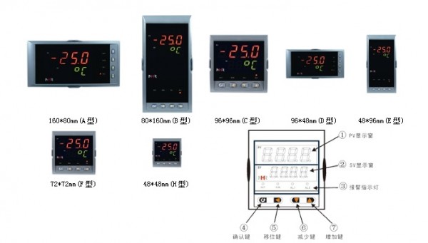 ★单路输入,双屏LED数码显示。 ★具备33种信号输入功能,可任意选择输入信号类型,测量精度为0.3%。 ★热电阻\热电偶信号分辨率可切换:1℃或0.1℃。 ★具备上下限报警功能,带LED报警灯指示。 ★具有电压、电流变送输出信号可选。 ★支持RS485串行接口,采用标准MODBUS RTU通讯协议。 ★带DC24V馈电输出,为现场变送器配电。 ★输入、输出、电源、通讯相互之间采用光电隔离技术。 ★具备多种外形尺寸及样式供用户选择。 ★参数设定密码锁定,参数设置断电保存。 |