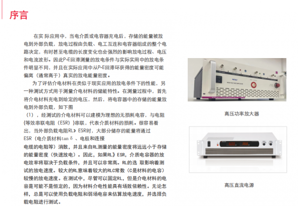 在实际应用中,当电介质或电容器充电后,存储的能量被放电到外部负载,放电过程由负载、电工互连和电容器组成的整个电路决定,有时甚至电缆的长度变化也会强烈的影响放电过程、电压和电流波形。因此P-E回滞测量的放电条件与实际实用中的放电条件明显不同,并且在实际应用中从P-E回滞环获得的能量密度可能偏离(通常高于)真实的放电能量密度。