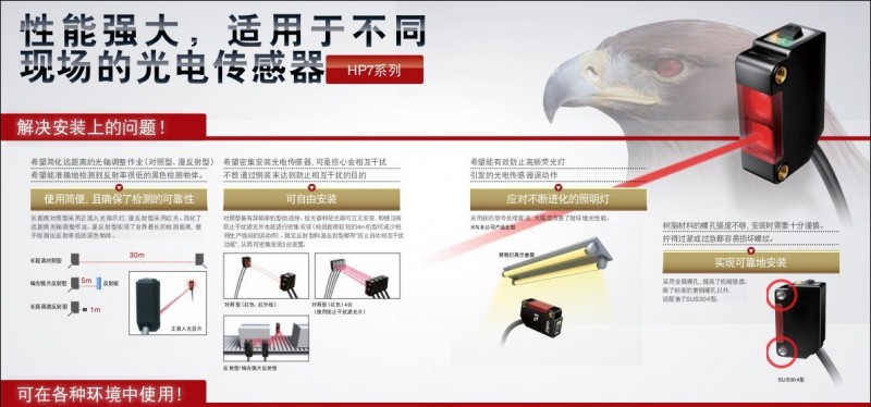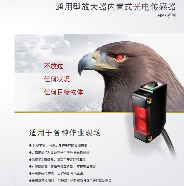 通用型放大器内置式光电传感器HP7系列,适用于各种作业现场。机型丰富,可满足多种多样的检测需要;大幅提高了对高频荧光灯等环
