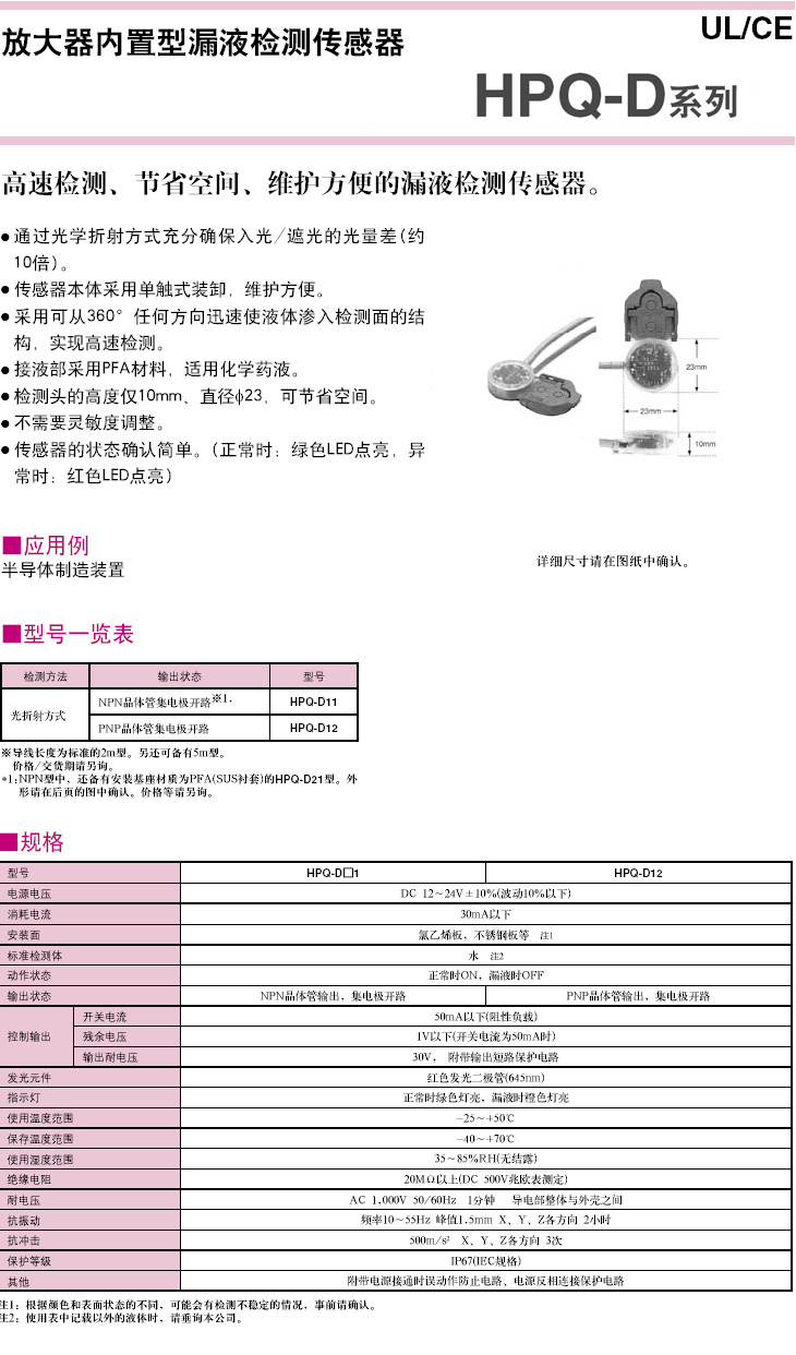 放大器内置型漏液检测传感器HPQ-D系列,高速检测、节省空间、维护方便的漏液检测传感器。