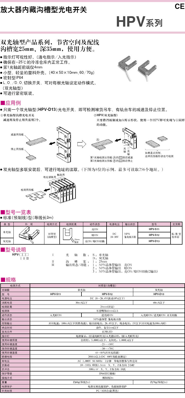 放大器内藏沟槽型光电开关HPV系列,双光轴型产品系列,节省空间及配线沟槽宽25mm、深35mm,使用方便。指示灯可视性好。(通电指