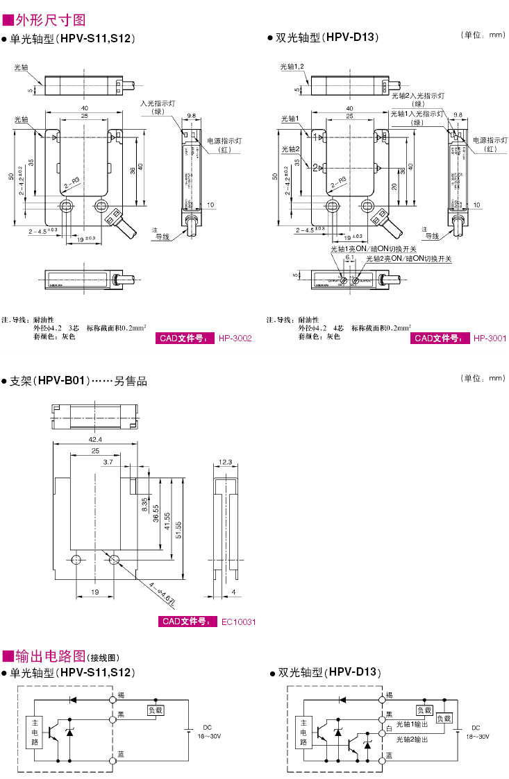 放大器内藏沟槽型光电开关HPV系列,双光轴型产品系列,节省空间及配线沟槽宽25mm、深35mm,使用方便。