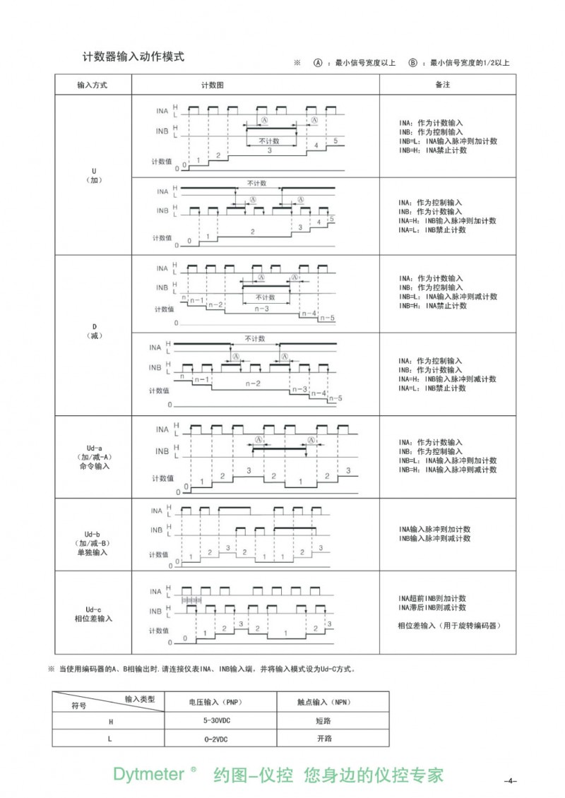 输入: 4种输入方式(加计数,减计数,同时加减计数,相位差输入),可配各种波形脉冲输入、光栅、接近开关、光电开关、触点开关、编码器等(NPN PNP均可),输入输出光电隔离,抗干扰能力强。
