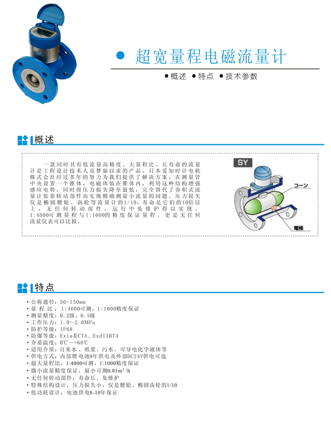 SY系列超宽程电磁流量计(日本进口)是一款低流量、大量程比、长寿命的流量计,无任何可动部件,运行中免维护得以实现。1:4000可测,1:1000精度保证。日本爱知时计电株式会社经过多年的努力为我们提供了解决方案,在测量管中央设置一个锥体,电磁体装在锥体内,利用这种结构增强感应电势,同时将压力损失降至zui低,完全替代了容积式流量计依靠转动部件而实现测量小的问题。