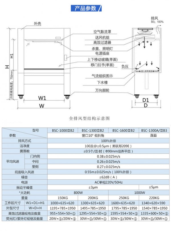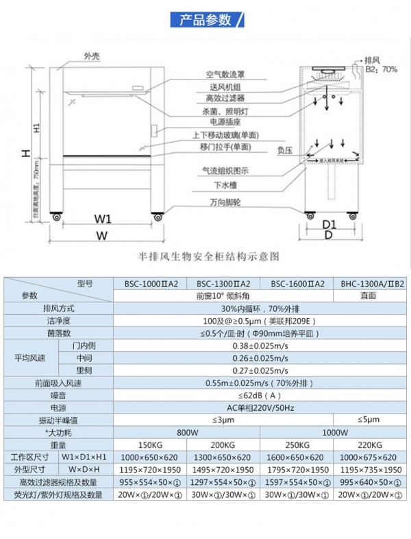 生物安柜由箱体、风机、过滤器、操作开关等几大部件组成。箱体采用材料制作,表面喷塑处理,工作台面采用不锈钢制作。净化单元采用了可调风量的风机系统,通过调节风机的工况,可使洁净工作区中的平均风速保持额定范围内,而且有效地延长了过滤器使用寿命。