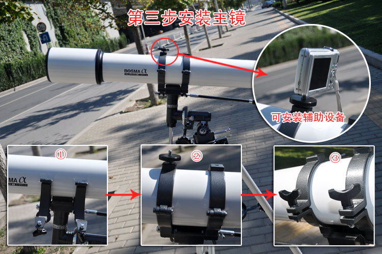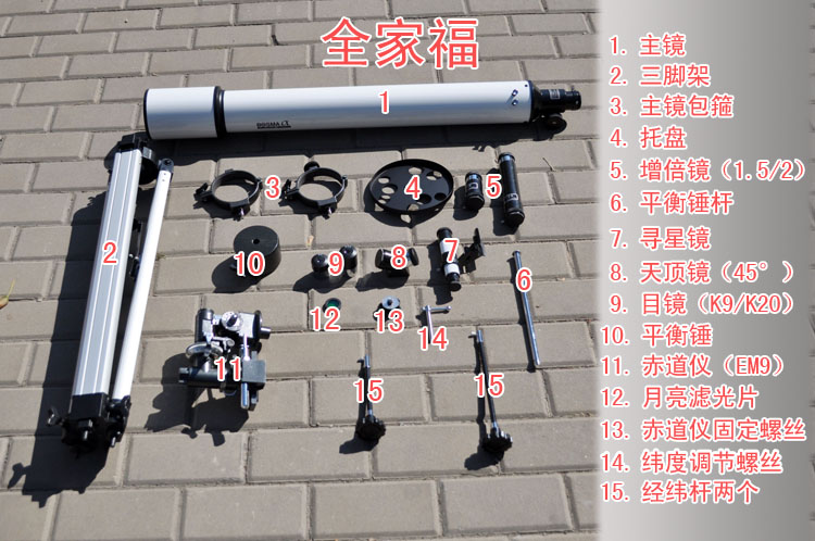 80900主镜筒、EM9赤道仪、双节铝合金三脚架、9mm目镜、20mm目镜、5X24寻星镜、45度正像天顶镜、2X增倍镜、月亮滤光镜、旋转星图、干燥剂、说明书、合格证保修卡、擦镜布