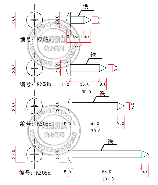 KZ08d总长100mm*直径9mm*头部直径20 mm