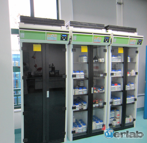 一台无管道净气型储药柜要同时过滤储藏在柜体内的化学品所挥发有气体以及实验室内的化学气体,所以对过滤效果和使用时限有很高的要求。