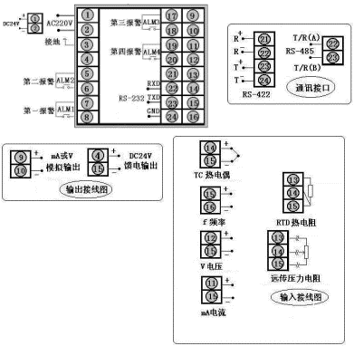 测量显示,通讯方式为RS232,输出方式为继电器输出,输入类型为PT100,一报警为上限报警,第二报警为下限报警,AC90~260V供电。