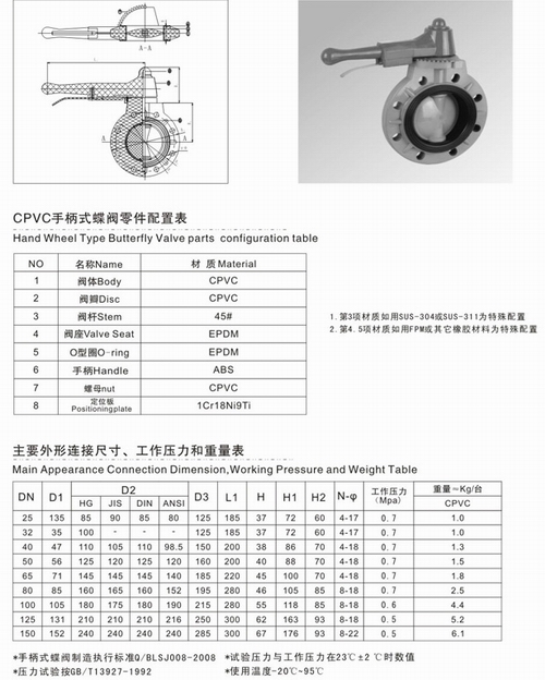 CPVC手柄式蝶阀 阀体重量轻、耐腐蚀性强 塑料原材料名称及适用温度: UPVC硬聚氯乙烯温度-10℃~70℃ ![]() |