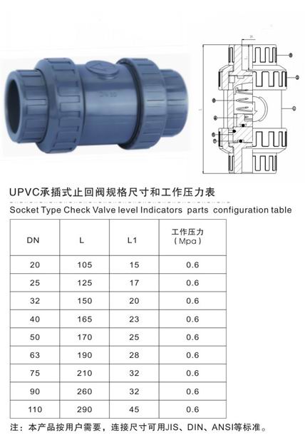 UPVC弹簧式止回阀 阀体重量轻,耐腐蚀性强; 塑胶阀门与管路系统连接的方式有: 对焊连接:阀门连接部位的外径与管材的外径相等,阀门连接部位端面与管材的端面相对进行焊接; 插口粘结连接:阀门连接部位为插口形式,与管件进行粘结连接; 电熔承口连接:阀门连接部位为内径敷设电热丝的承口形式,与管材进行电熔连接; 承口热熔连接:阀门连接部位为承口形式,与管材进行热熔承插连接; 承口粘结连接:阀门连接部位为承口形式,与管材进行粘结承插连接; 承口橡胶密封圈连接:阀门连接部位为内镶橡胶密封圈的承口形式,与管材进行承插连接; 法兰连接:阀门连接部位为法兰形式,与管材上的法兰进行连接; 螺纹连接:阀门连接部位为螺纹形式,与管材或管件上的螺纹进行连接; 活接连接:阀门连接部位为活接形式,与管材或管件进行连接。 一个阀门上可以同时具有不同的连接方式。 常用材质相关介绍: |