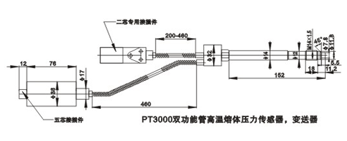 四、PT3000带软管温度压力双功能高温熔体压力传感器及变送器:
