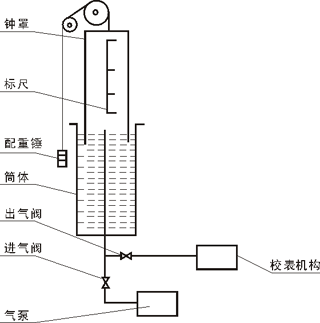 气体计量器是以钟罩内有效容积作为标准体积,当钟罩下降时,排出钟罩内气体经测试管通往被检仪表,比较钟罩内排出的气体体积与被检仪表指示的体积,求取仪表的精度。