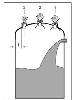 - 喇叭天线必须调整至垂直,不要让雷达束指向罐壁。