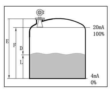 通过输入空罐高度E(=零点),满罐高度F(=满量程)及一些应用参数来设定,应用参数将自动使仪表适应测量环境。对应于4-20mA输出。