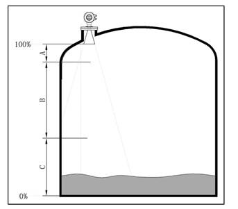 - 若介质为低介电常数当其处于低液位时,罐低可见,此时为保证测量精度,建议将零点定在低高度为C 的位置。