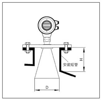 - 如果喇叭直径大于安装短管的直径,包括延伸管在内的天线需要从容器里面安装,并将仪表抬高。选择延伸管使仪表至少抬高100mm。