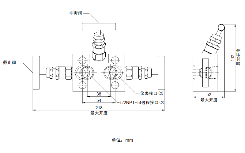 出口(2×):方法兰(与变送器连接)中心距54mm.