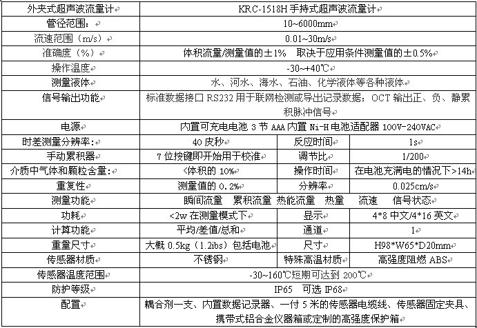 KRC-1518H手持式流量计的用户界面灵活使用简单;适用于各种尺寸管道液体流量计量;非接触式测量方式、体积小、携带方便;内置充电电路充电电池工作时间12小时以上;4行汉字同屏显示瞬时流量、流速、累积流量、信号状态等;内置数据记录器、可记录日期、累积流量、信号状态、工作时间等;标准数据接口RS232用于联网检测或导出记录数据;OCT输出正、负、静累积脉冲信号和原频率信号(1-9999KHZ).
