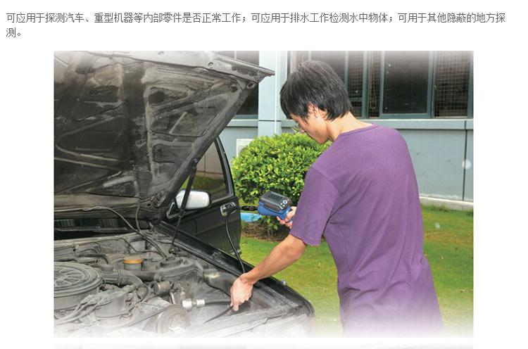 BS-150内窥镜/视频仪带有3.2”彩色液晶显示,支持图片或视频,时间或日期显示功能及多种语言功能。视频和图像可通过SD卡或USB线输入电脑,可用于探测无法看见的机器(汽车、重型机器)内部零件来检测机器是否正常运