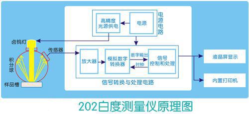 仪器主要由光源、积分球、光电探测器、信号采集,放大,转换和处理电路、电源电路、液晶显示、以及打印机等部分组成。 |