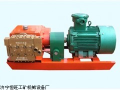 1、BPW250/10(5.5、6.3)型喷雾泵为卧式三柱塞往复泵。由三相异步四电机驱动,经一级齿轮减速,带动三曲拐曲轴旋转,再经连杆、滑块带动柱塞作往复运动,使工作液在泵头中经吸排液阀组吸入和排出,从而使电能转换成液压能,输出压力水供采煤机等使用。本泵具有压力平稳、脉动冲击小、抗污防腐性能强、使用寿命久等特点。