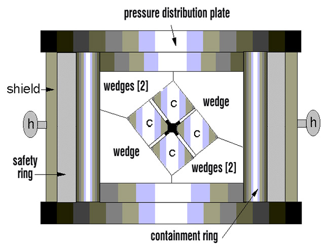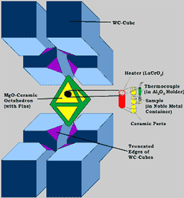 近,哥伦比亚大学的David Walker教授解决了如何使得大块物体的压力维持在50-250 kbar的主要技术障碍,他提出了将多顶砧简化的设计和技术。正如横截面示意图下端所示,一个圆柱形的楔子被用来固定WC压砧。楔子并没有固定,可以在支撑环内浮动。大型支撑块没有被使用,加压过程中的弹性应变通过支撑环加以消除。