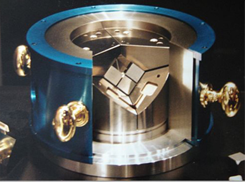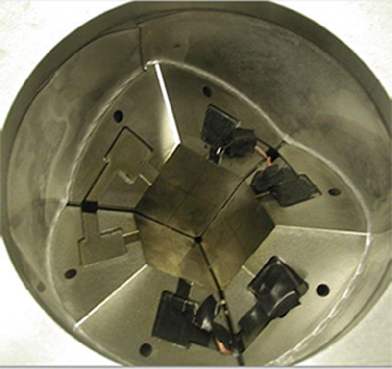 移开上压力盘后,可以看到安装在WC立方体上的三个圆柱形楔子。安装在外部的旋钮很容易操作压力模块。旋钮之间的端口为应变仪提供了检测空间。