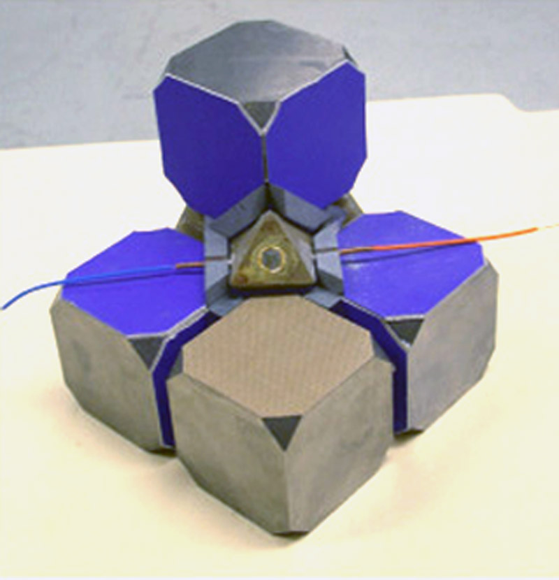 Rockland多顶砧装置可提供的压力高达250 kbar,温度高达3000 ℃。如图A所示,样品被放入一个八面体内,外部压力传递物质则由氧化铝、叶腊石或其它陶瓷材料组成。八面体的八个面分别由八个碳化钨(WC)立方压砧切角而成(图A的橙色区域)。立方体依次被嵌入由工具钢制作而成的半球形底座或圆柱形底座内,然后被切割成分段以匹配更大的支撑模块。到目前为止,这些装置非常笨重,需要花费大的压力和操作使得它达到相应压力。