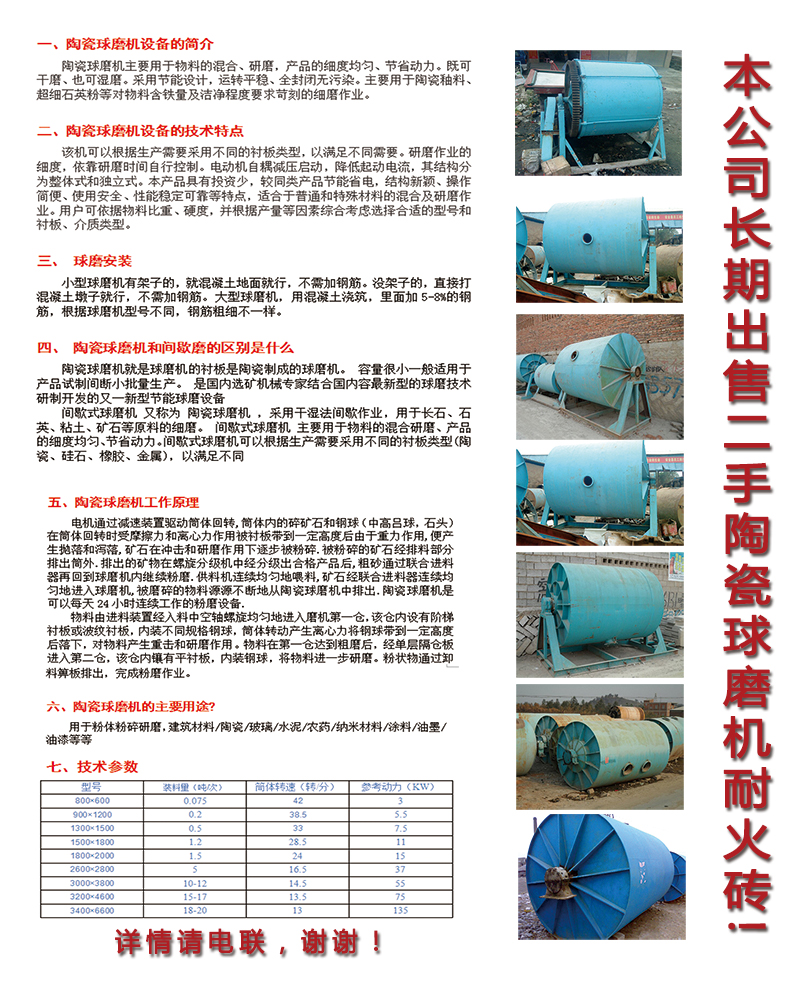 本公司长期出售二手球磨机及耐火砖,可随时提货,有需要的朋友请致电联系,谢谢!
