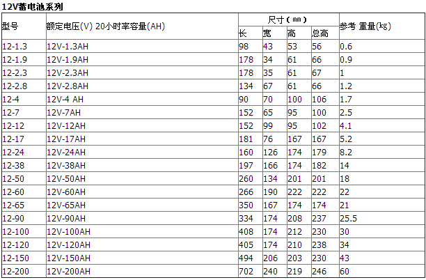 电池型号 额定电压 长(mm) 宽(mm) 高(mm) 重量(kg)