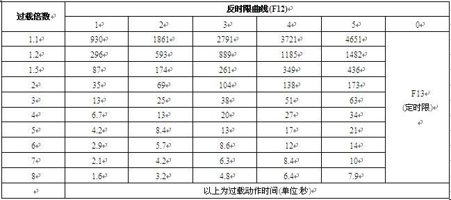 过载动作时间和过载电流的大小有关,负载电流超过额定电流越多,则动作时间越短。可根据不同电机的特性选择不同的反时限曲线,JFY-802、808均提供5 条反时限曲线,见下表: