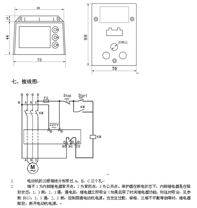 通过内置的电流互感器检测负载电流,所以被保护电机的三根相线必须分别穿过电流互感器的三个小孔。