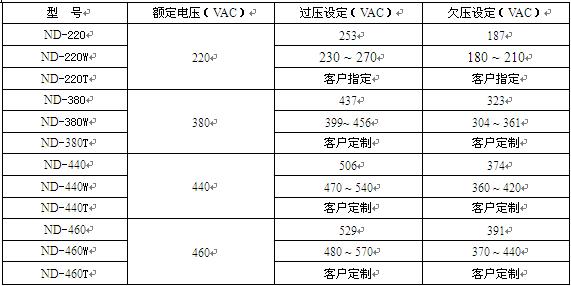 5)欠压保护:指被保护线路电压低于设定值,延时3~8S动作,恢复回差为3~20VAC。