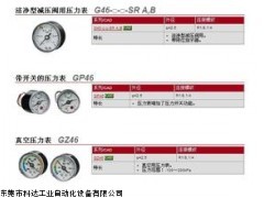 SMC压力表 压力表中文版: G_CN 一般用压力表 G * 系列 大小((外径)) (O.D.) 连接螺纹 G * (EN) φ15, φ26, φ37.5, φ42.5, φ43, φ44 1/16, 1/8, 1/4 禁油/外部铜系不可用的压力表 现货G46E 系列 大小(外径) (O.D.) 连接螺纹 现货G46E (EN) φ42.5 1/8, 1/4 洁净室用压力表 G49 系列 大小(外径) (O.D.) 连接螺纹 G49 (EN) φ44 1/4 洁净减压阀用压力表 现货G46- * - * -SRA,B 系列 大小(外径) (O.D.) 连接螺纹 现货G46- * - * -SRA,B (EN) φ42.5 1/8, 1/4 带限位开关的压力表 GP46 系列 大小(外径) (O.D.) 连接螺纹 GP46 (EN) φ42.5 1/8, 1/4 数字式压力传感器 GS40 系列 设定压力 (MPa) GS40 0 ~ 0.98 特点 把压力开关功能加到数字显示的压力计上 小型压力计 PPA 系列 设定压力 适合管子(外径) 类型 PPA100 -0.1 ~ 1MPa φ4, φ6 高压用 PPA101 -101 ~ 10kPa 真空压用 PPA102 -10 ~ 100kPa 低压用 特点 携带性优良的压力计
