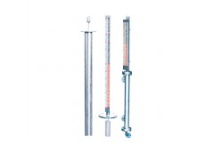 如图所示液位计适用于地下槽池罐、高架储罐的液位测量和控制。该产品主体分上、下二部分,上部分安装显示器,主体内放磁球。下部分导管浮球插入罐内接触液体,上、下二部分内的磁浮球和浮球通过连接杆连接,在导管内浮球随着液体的上、下浮动动带动上面主体内的磁球,其他工作原理和侧装式相同。该产品可以安装模似信号传感变送器,XQ型发讯器,就可实现DB型,EB型产品功能。该型号产品用同样原理做成底部安装方式其功能不变。也可以在储罐的侧面做一个浮桶,用法兰和储罐连接,在安装插入型液位计。
