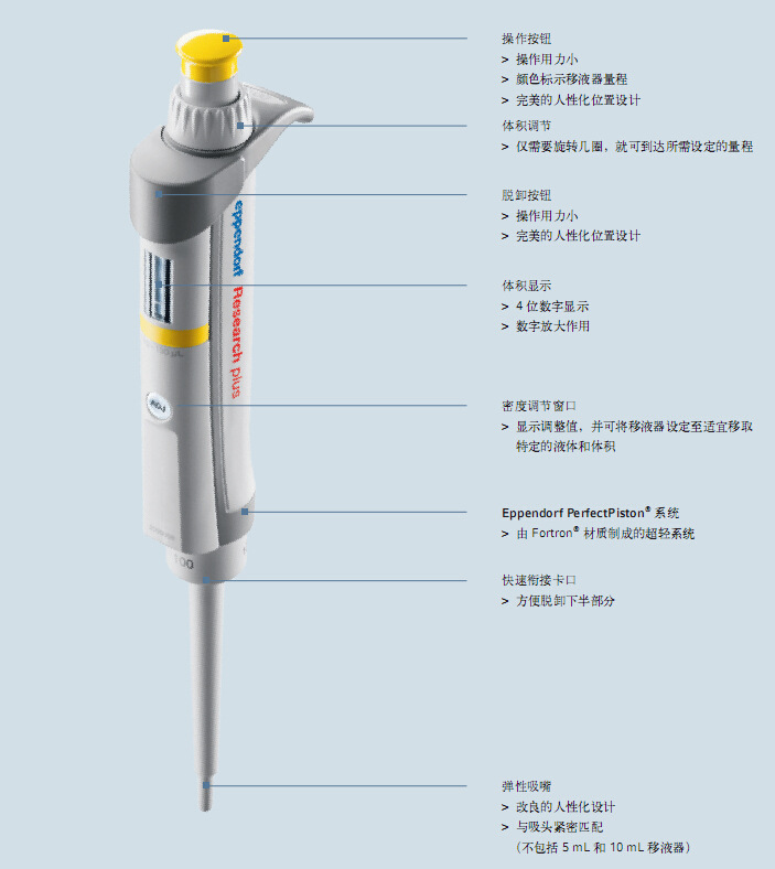 Research plus 移液器符合人体工程学设计,重量轻,且操作用力小,可以有效防止手部重复性劳损(RSI)。其前端的吸嘴具有伸缩性,不但可使安装和脱卸吸头更加省力,还能保证吸头和移液器之间的气密性。