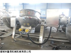 )产品介绍:本产品锅体为一次冲压成型的半球形不锈钢锅体,采用蒸汽、液化气、天然气等加热形式,搅拌方式采用特殊的倾斜式传动,使用的行星式搅拌器与锅体充分接触,实现传动公转与自转的不整数传动比,使锅内无搅拌死角。使用的传动与密封结构,使传动部分与锅内洁净、卫生。采用变频调速动力,运行更平稳。另本机采用液压升降,翻锅运料,免拆装搅拌器,节省人力,降低劳动强度,是性能优良的食品加工设备。
