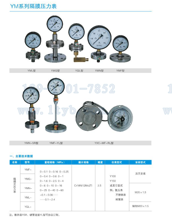 联泰仪表不锈钢隔膜压力表YMN-SR-100/150适用于测量具有一定腐蚀性、非凝固或非结晶的各种流体介质的压力或负压。压力表中能仪表。 隔膜压力表 耐腐蚀性能取决于膜片材料.
