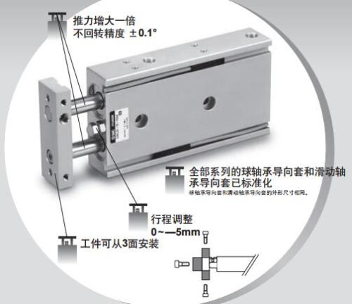 杆侧端盖上设有导向套,以提高SMC气缸的导向精度,承受活塞杆上少量的横向负载,减小活塞杆伸出时的下弯量,延长气缸使用寿命。