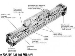 活塞通过磁力带动缸体外部的移动体做同步移动。它的工作原理是:在活塞上安装一组高强磁性的磁环,磁力线通过薄壁缸筒与套在外面的另一组磁环作用,由于两组磁环磁性相反,具有很强的吸力。当活塞在缸筒内被气压推动时,则在磁力作用下,带动缸筒外的磁环套一起移动。气缸活塞的推力必须与磁环的吸力相适应。