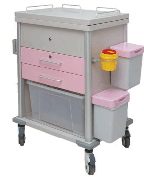 上推拉式平台,四周有围栏,带安全锁左侧上方后面1只病历夹挂篮、前面1只3M洗手液挂架、下方1只斜口挂篮。右侧后面和下面各1只翻盖方桶、前面1只(ф117)小号锐器盒圈。背部1只折叠凳。(方便护士喂奶,拍奶)